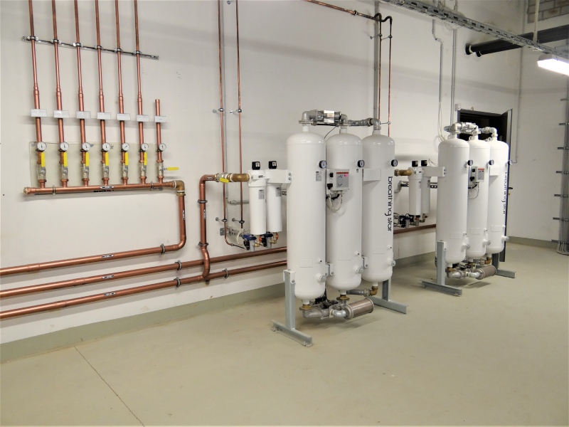 吸附式干燥機對壓縮機供應的壓縮空氣通過干燥劑和凈化劑來提供醫療呼吸空氣。壓縮空氣由在兩個干燥塔交替干燥。干燥過后的空氣隨后在第三塔中被凈化,由此去除殘油等污染物。